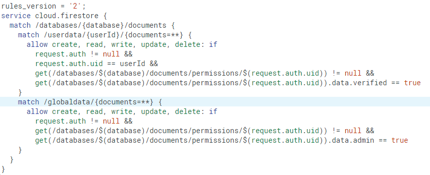 You could also have a collection of users, and in each document (named after the user uid) have their permissions. Here for example, you could allow every user with the permission verified to access their own document in the userdata collection, and every admin to access documents in the globaldata collection: