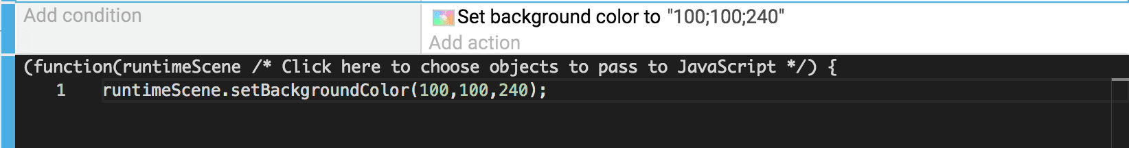 . This variable represents the scene being played. Below is an example of a standard GDevelop event, and an equivalent event that uses a JavaScript: