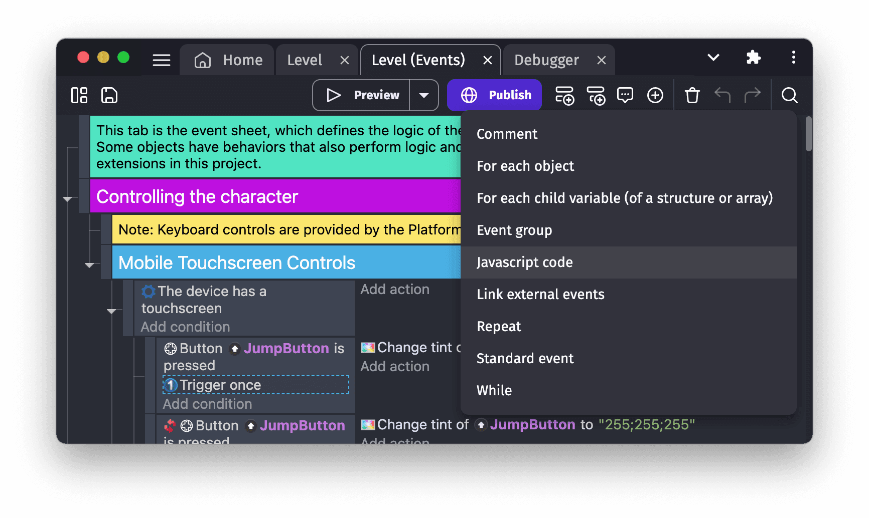 To add a JavaScript event, click on the + button in the Events Sheet toolbar, and select JavaScript code: