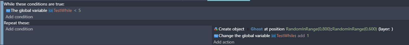 While events are usually not needed, but these events can be used to repeat actions as long as a given set of conditions is true. The While event is useful for algorithms that you may want to create in your game.
