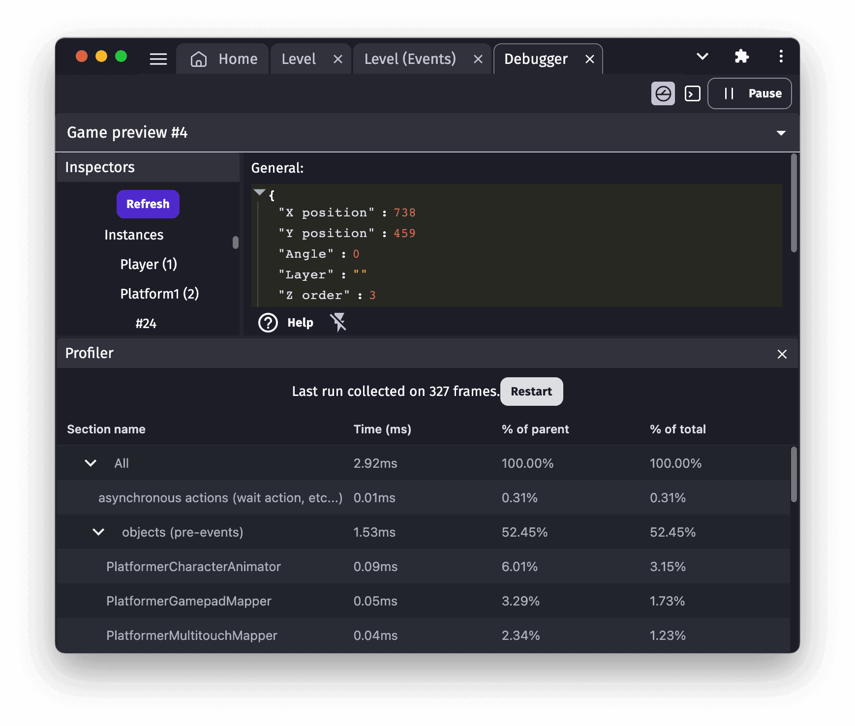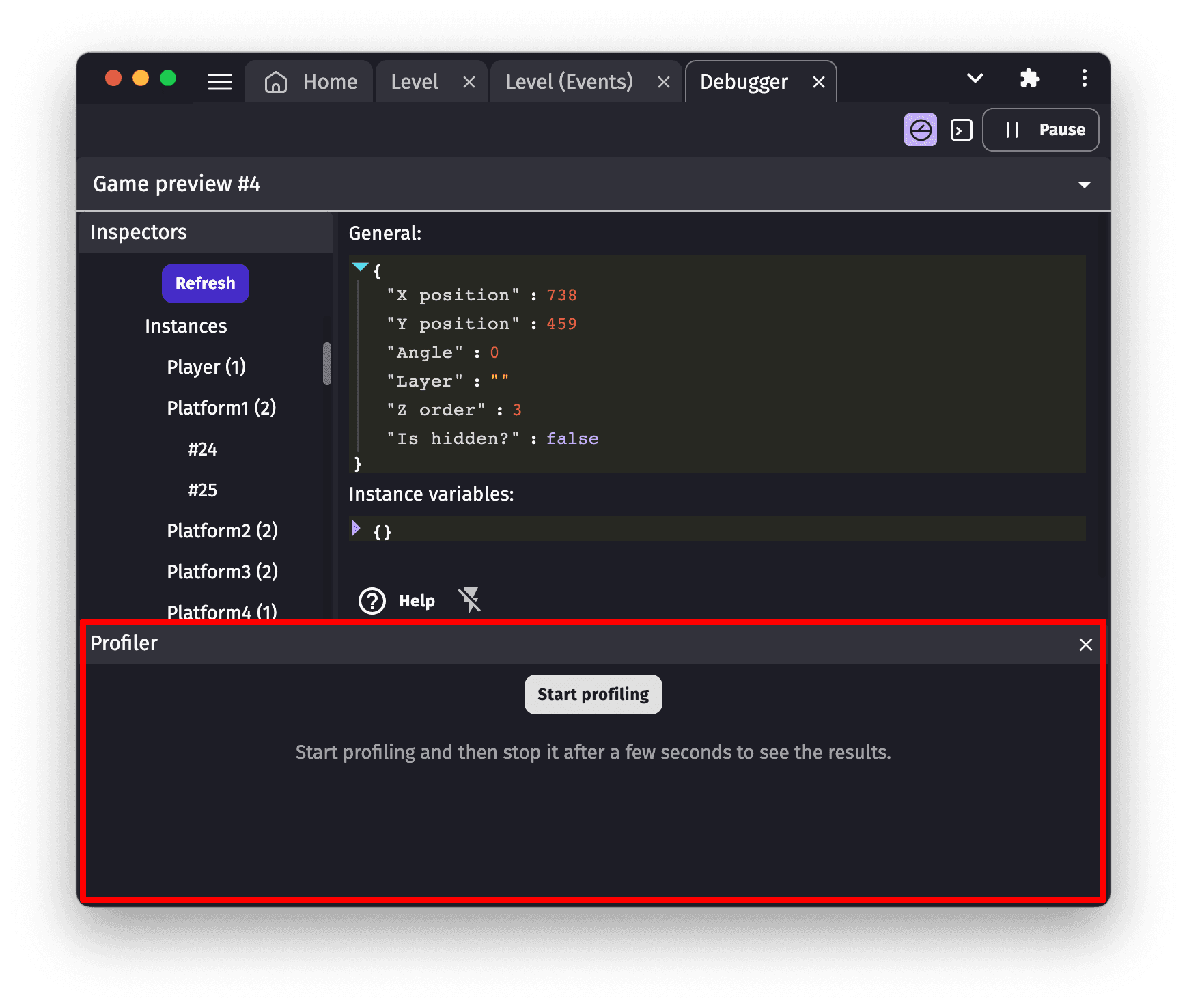The Profiler is a tool that measures the time spent on different aspects of your game while it is running. It helps to find bottlenecks between your events and the rendering of the game that could be taking up a lot of resources.