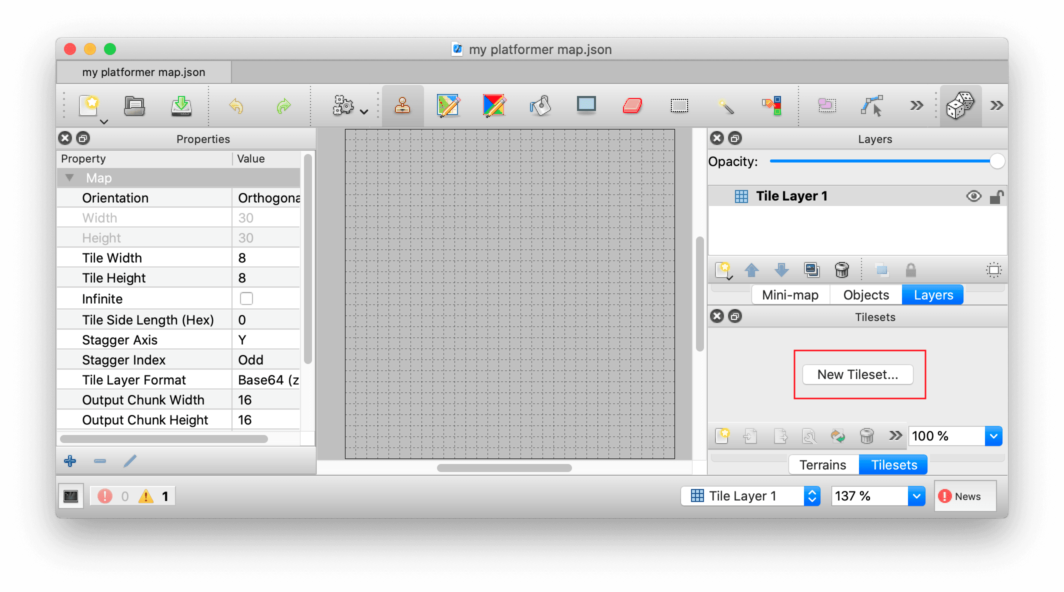 Choose CSV, Base 64 or Base 64 (zlib compressed) for the tile layer format (Zstandard compressed is not supported). Choose the size of the tilemap and the size of the tiles. Using infinite map mode is not supported: