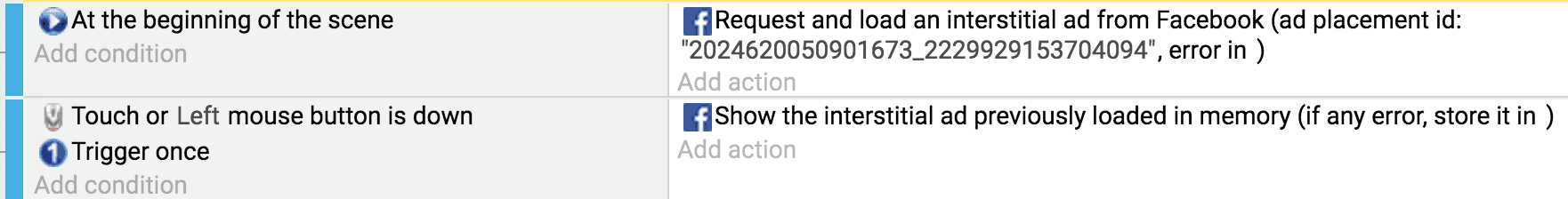 - Add an action "Load and prepare an interstitial ad" (in "Facebook Instant Games", "Ads").