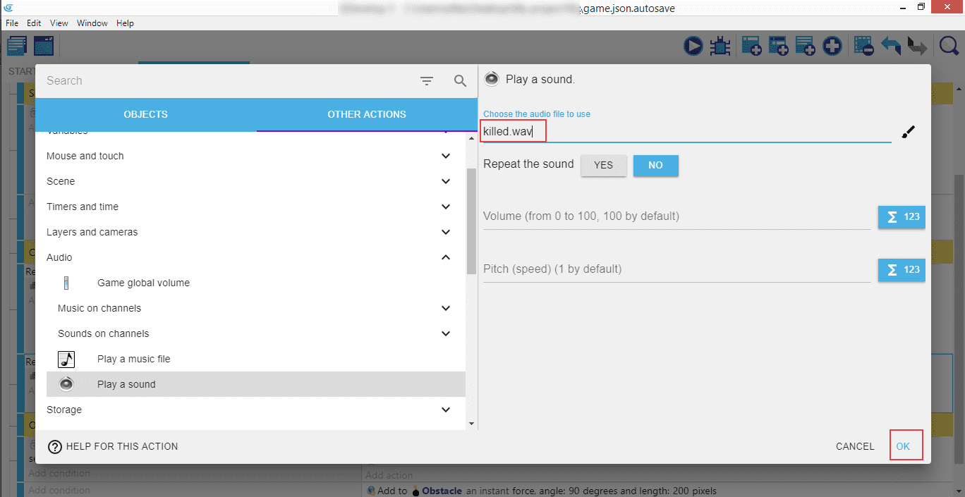From within "Other actions" we're going to add a different sound when that happens. "Audio", "Play a sound", "Choose a new audio file" to open the file explorer window.