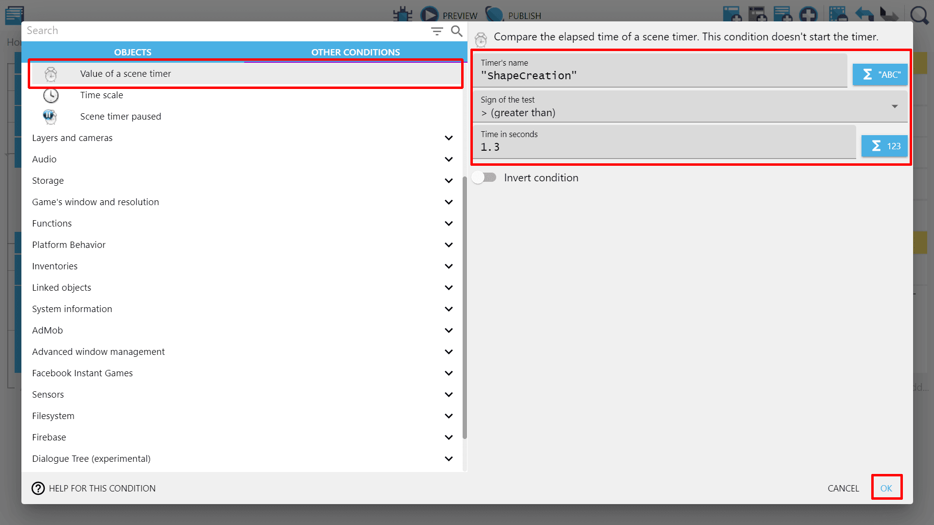 Then from the dropdown, select "Value of a scene timer" and enter two values. First is 1.3 in the "Time in seconds" field which will represent the number of seconds - every 1.3 seconds we will drop new shape onto the scene.