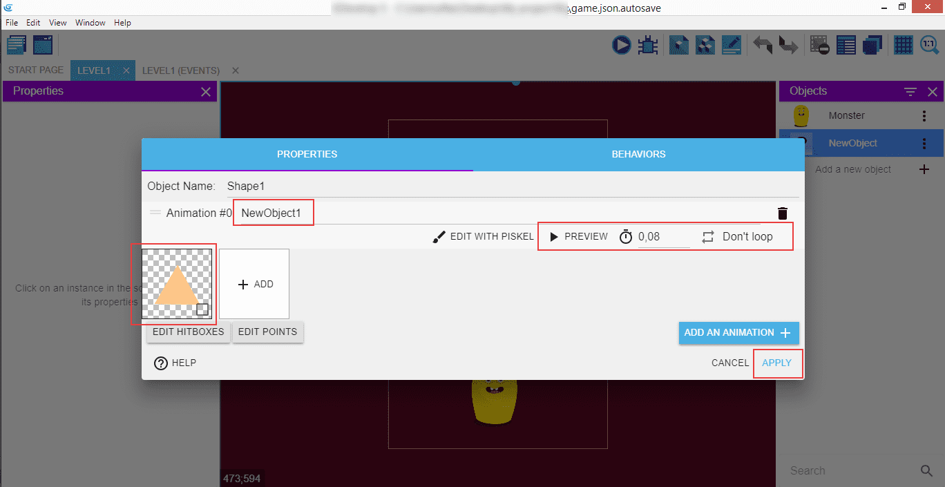 Do the same for the second shape: "Shape2" as the name, "NewObject2" as the animation, and a square image, then "Apply".