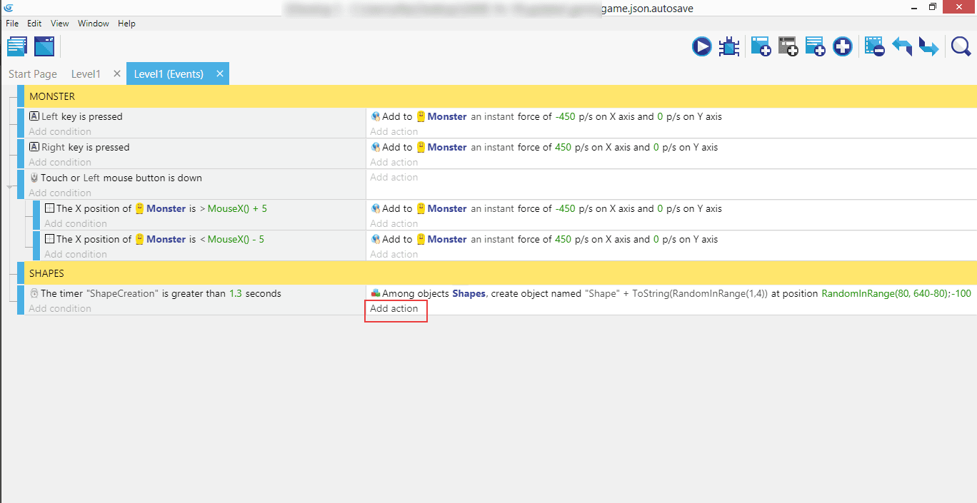 Next create a new event above the shapes event and give it the condition "at beginning of the scene", and copy/paste the earlier create "Start (or reset) a scene timer" action for "ShapeCreation" to this new event. This will start the timer at the beginning of the game in so the shapes event will trigger the first time.
