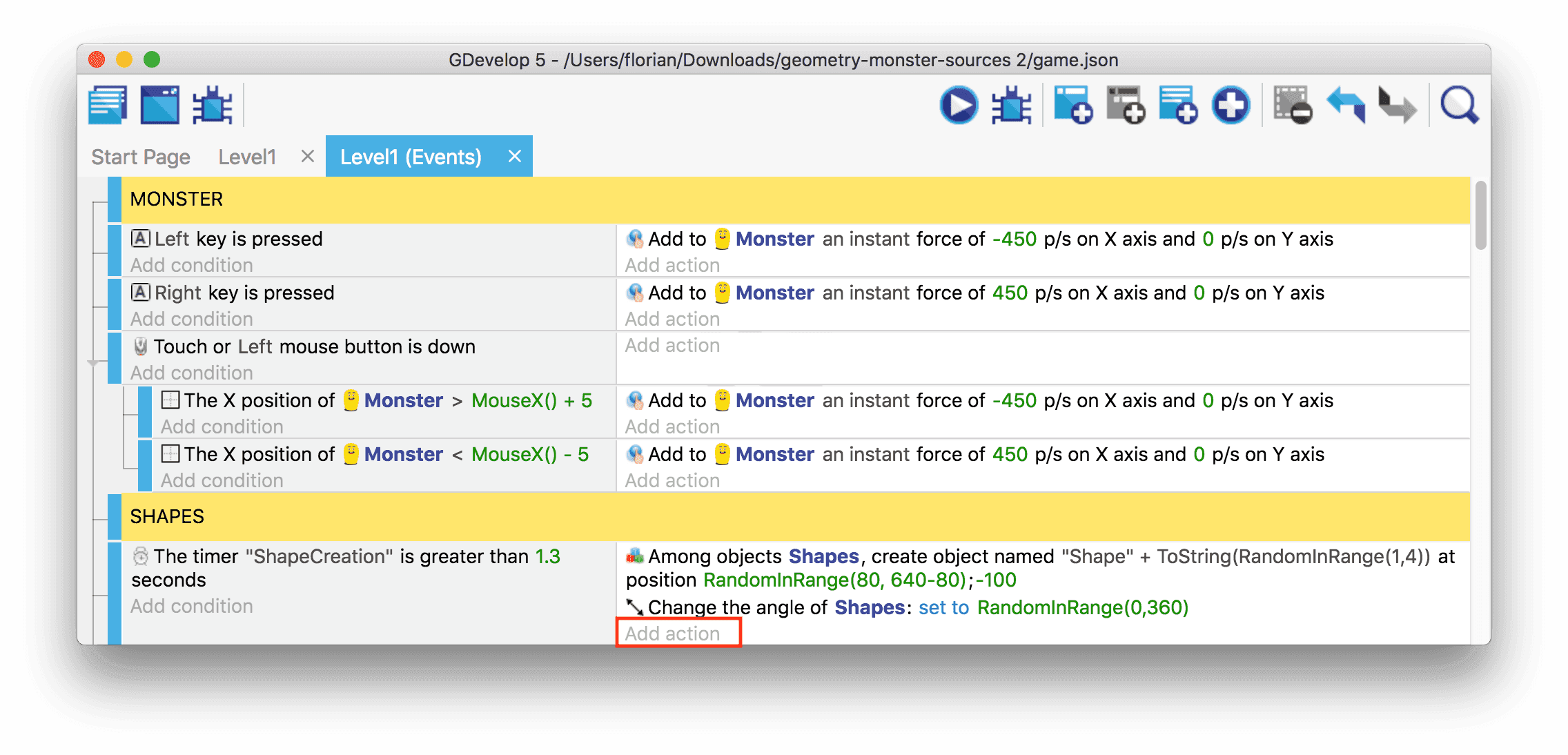 Add an action: select "Shapes", then "Add a force (angle)", and set the "Angle" to 90, and "Speed in pixels per second)" to 100.