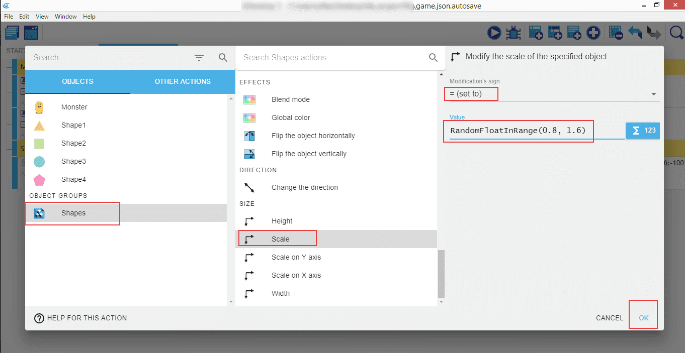 Click on "Shapes", then look for "Scale", select = (set to) and enter RandomFloatInRange(0.8, 1.6). This will customize our shapes even more by introducing random scaling - some of them will be a little bit smaller than the original (80% of the original), and some will be bigger (160%).