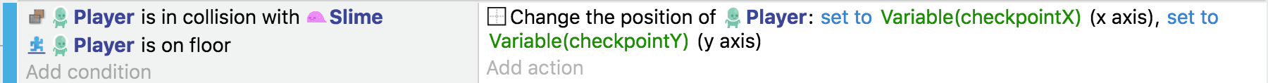 The condition now stores the X and Y position of the "checkpoint" object with which our "Player" object has collided. So, instead of deleting the "Player" sprite object, we set its X and Y positions using the variables.