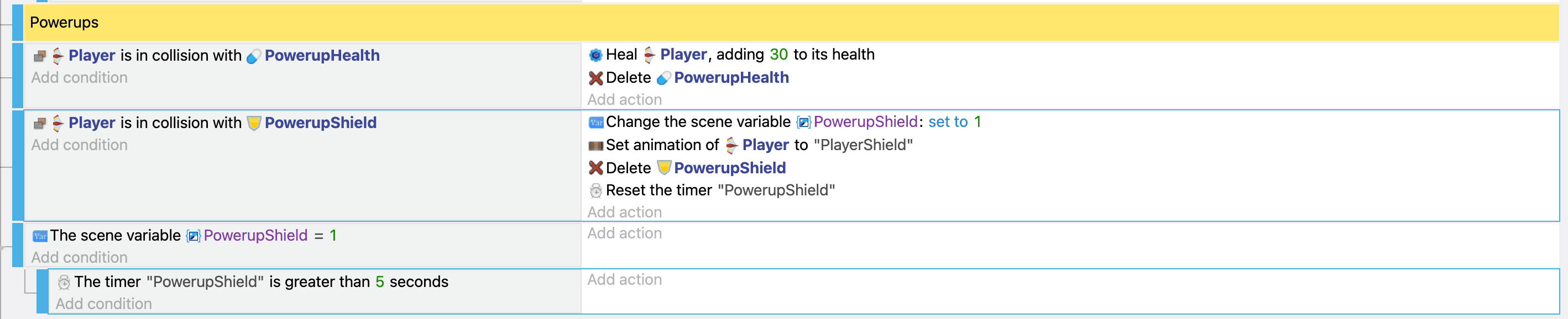 Then, add some further actions to set "PowerupShield" to 1, delete the "PowerupShield" object, and reset a timer called "PowerupShield." In the end, you should see these events: