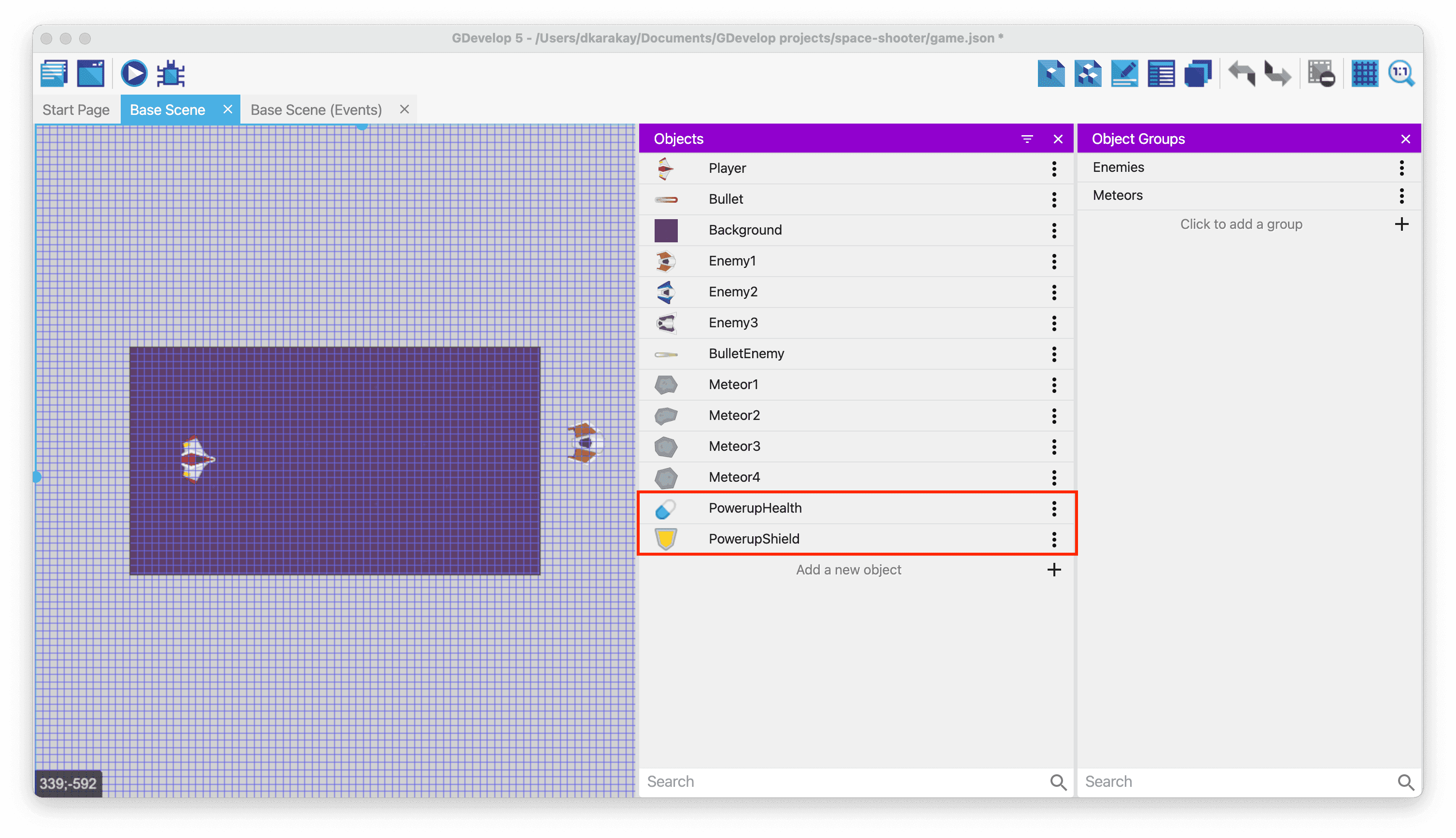 We will add two objects called "PowerupHealth" and "PowerupShield." Select the "powerup_health.png" image from the assets folder for the health object. Repeat the same process for shield object by choosing the "powerup_shield.png" image. In the end, you should see: